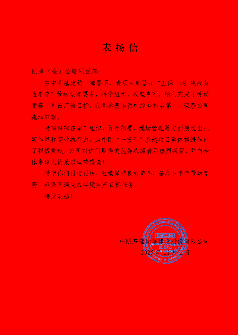 11月1日,在業(yè)主單位中剛基礎(chǔ)設(shè)施建設(shè)股份有限公司(以下簡(jiǎn)稱“中剛基建”)組織開展的“五保一樹-決戰(zhàn)黃金旱季”勞動(dòng)競(jìng)賽中,剛果(金)公路項(xiàng)目部以科學(xué)組織、攻堅(jiān)克難的作風(fēng),順利完成十月份產(chǎn)值目標(biāo),在各參賽單位中脫穎而出,榮獲流動(dòng)紅旗榮譽(yù)及表揚(yáng)信。 剛果(金)公路項(xiàng)目部高度重視勞動(dòng)競(jìng)賽活動(dòng)目標(biāo),緊抓旱季施工的黃金季節(jié),以“起步即沖刺、開局即決戰(zhàn)”姿態(tài),鼓足干勁,全力以赴掀起施工熱潮。項(xiàng)目部在施工組織、資源部署、現(xiàn)場(chǎng)管理等方面展現(xiàn)出扎實(shí)的作風(fēng)與高效執(zhí)行力。全體員工頑強(qiáng)拼搏、精心施工,緊扣任務(wù)節(jié)點(diǎn),優(yōu)化施工組織,抓牢安全質(zhì)量,為中剛“一攬子”基建項(xiàng)目推進(jìn)作出了積極貢獻(xiàn)。 此次獲得的榮譽(yù),是項(xiàng)目團(tuán)隊(duì)全體參建人員拼搏奮斗的成果,是對(duì)項(xiàng)目部全體員工攻堅(jiān)克難精神的充分肯定。項(xiàng)目部將以此次表彰為契機(jī),再接再厲,全力確保高質(zhì)量完成年度生產(chǎn)目標(biāo)任務(wù),為公司國(guó)際業(yè)務(wù)建設(shè)發(fā)展再立新功。